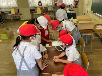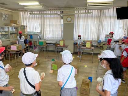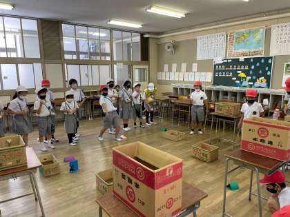 「まとあて」コーナーです。こちらのまとあては、得点の書かれた箱に玉を投げ入れます。なかなかむずかしいので、入るとみんなが大喜びです。