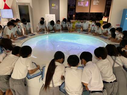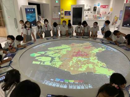 次に、円形のテーブル型ディスプレイで、大阪市の地形の特徴や大規模災害時に想定される被害状況等について学びました。次々と変わっていく映像に思わず見入ってしまいました。