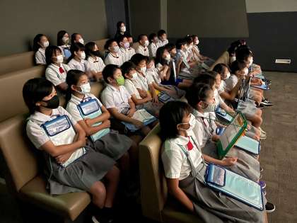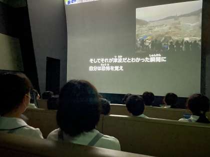 続いて、シアターで東日本大震災を体験した方のお話を聞きました。子どもたちは、リアルな映像も受け止めながら、しっかりとお話を聞いていました。
