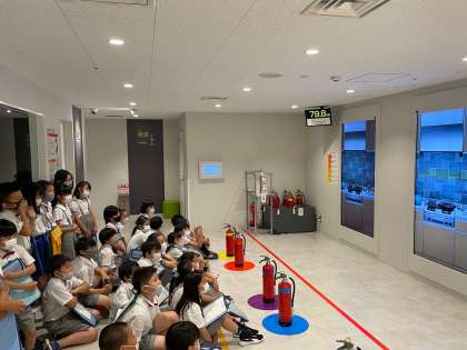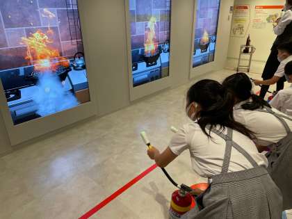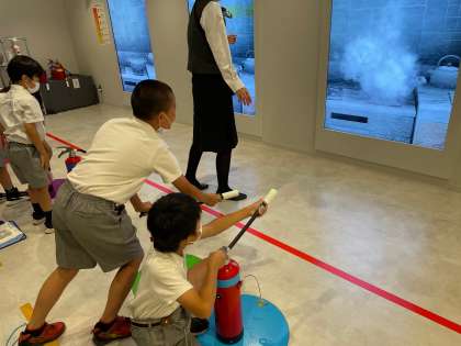 続いて、消化器を使って、バーチャル消化体験をおこないました。いざという時のために、使い方をしっかりと覚えておくことが大切です。