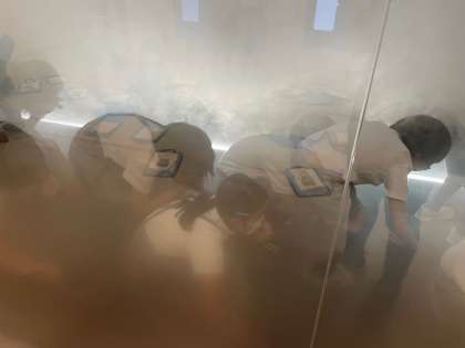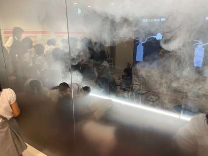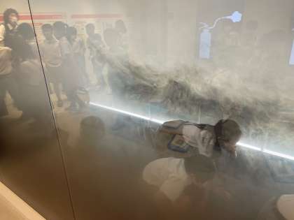 続いて、体に害のない煙が充満する通路を使って、火災が起きた際の避難の仕方について学びました。リアリティのある体験を通して、姿勢を低くすることの大切さを実感しました。
