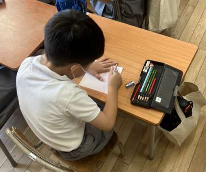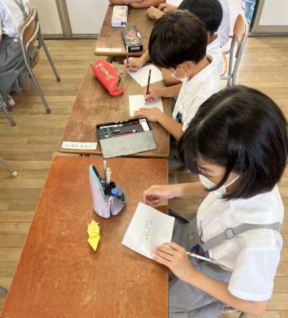 まずは、一人ひとりが、おりがみに平和への願いを込めたメッセージを書きこみました。