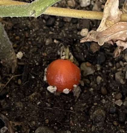 また、土の上にひとつ落ちているのを見ていると...それは「おちた君」です。「おちた君」もはじめは緑だったけど、つるから落ちたあとも土の栄養と水を吸って赤くなりました...と教えてくれました。