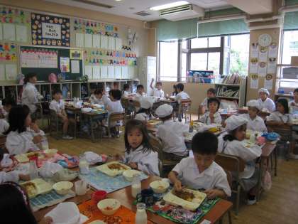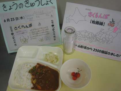 今日のメニューは「ハヤシライス、キャベツのゆずドレッシング(年1回)、さくらんぼ(1人3個・年1回)、牛乳」でした。初夏の町を一瞬彩って去っていくさくらんぼは、季節感を豊かに伝える数少ない果物のひとつです。さくらんぼは花を楽しむ桜の実ではなく、『西洋実桜』という果樹になる果実です。日本へは明治の初めに導入され、以来山形でさかんに栽培されています。今日届いた【佐藤錦】という種類は、日本のさくらんぼの代表的な品種です。赤みが強く大粒で果肉はやわらかく甘いのが特徴で「赤いルビー」とも呼ばれています。1年生で初めてさくらんぼを食べた児童は15%(22人)で、びわ(63%)と比べて身近な果物のようです。色がきれいでかわいいさくらんぼに、子どもたちは目をキラキラさせていました。