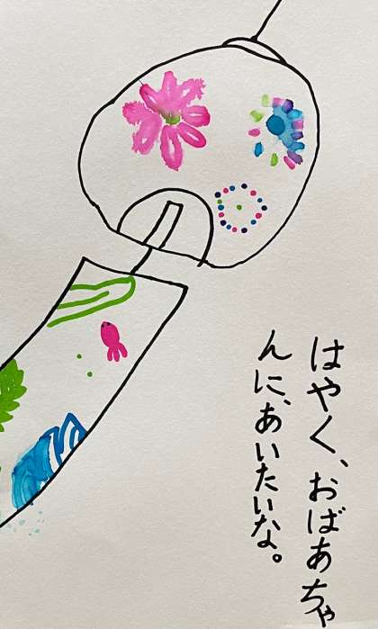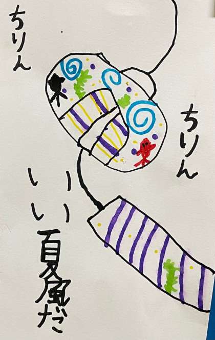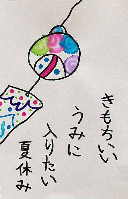2年生の作品です。涼しげな風鈴を描き、夏らしい言葉を添えました。