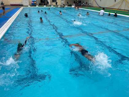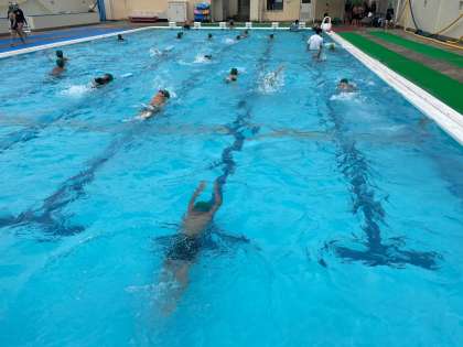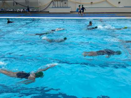 縦のコースを何本も泳いでいます。水の中ではしっかりと身体が伸びていますね。