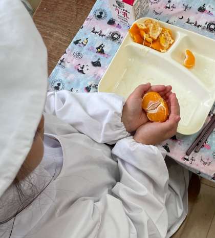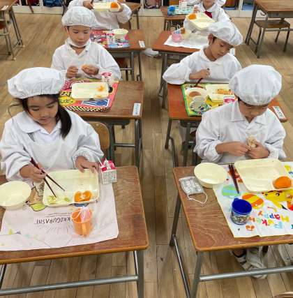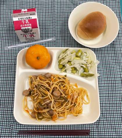 1年生の給食時間です。今日のメニューは、チキントマトスパゲッティ、グリーンアスパラガスとキャベツのサラダ、冷凍みかん、黒糖パン、牛乳です。冷凍みかんの皮をきれいにむいて、大切そうに手にだっこしていますね。今日が1学期最後の給食、おいしい給食ごちそうさまでした!