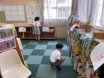 暑さが厳しい今朝も、早くから子どもたちが図書館にやってきました。