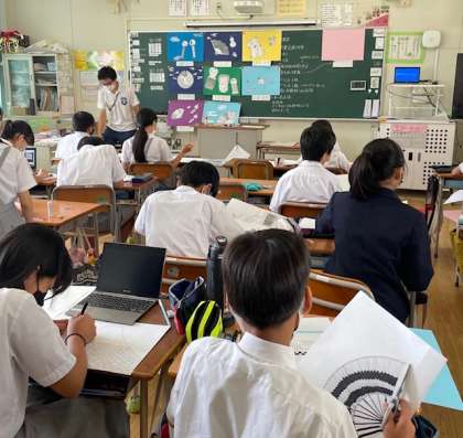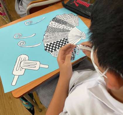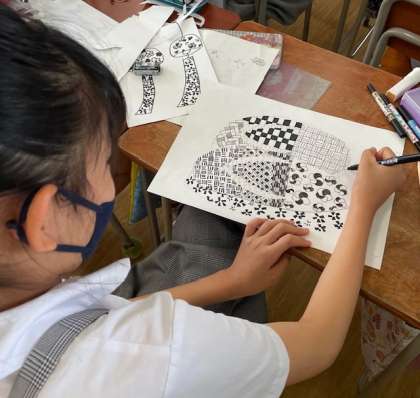 6年生の図画工作の時間です。和の文化を黒と白のモノトーンで表現します。
