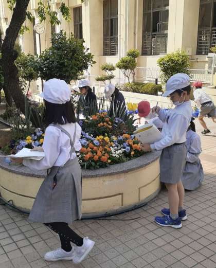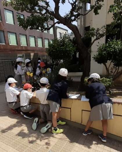 3年生の理科の時間です。春のまだ涼しい時期に校内の草花を観察しているところです。今の厳しい暑さから考えると、とてもうらやましいですね。