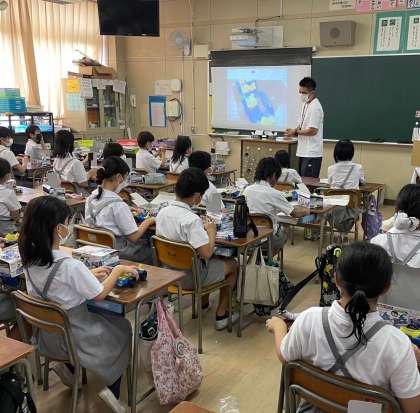 4年生の理科の時間です。電流の大きさや向き、乾電池につないだものの様子などに着目して、電流のはたらきについて調べています。
