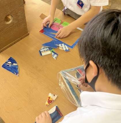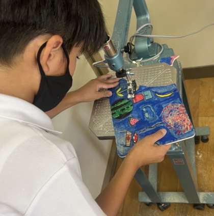 高学年らしく、電動糸のこぎりを自在に使って、板材を曲線に切ったり、切り抜いたりしながら、自分の思いに沿った作品をつくっています。