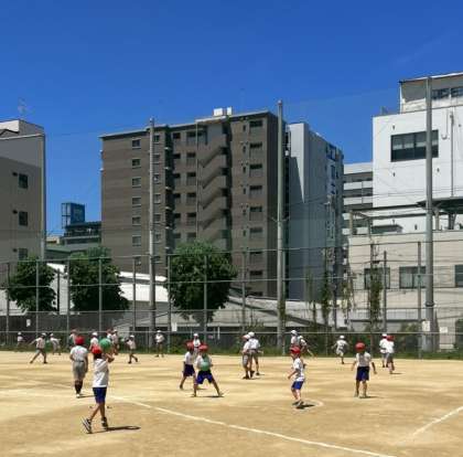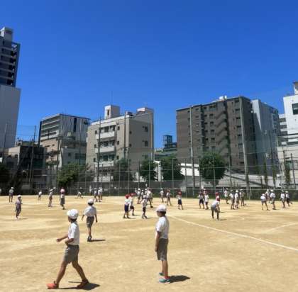6月下旬の20分休み、青く美しい空が広がる中、グラウンドで元気に遊ぶ子どもたちの様子です。