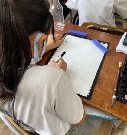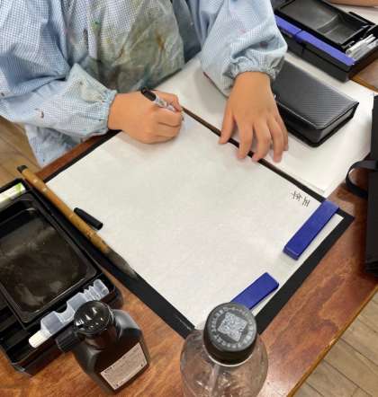 半紙にペンで名前をしたため、気持ちを整えたあと、さあ、いよいよはじめの一筆です。
