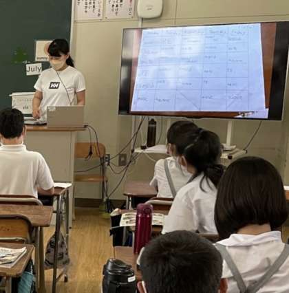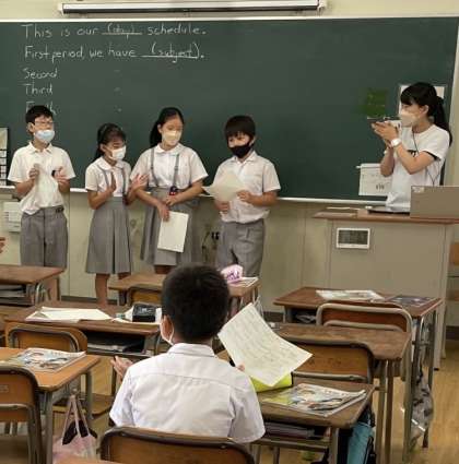 5年生の外国語の時間です。自分たちの一日の具体的なスケジュールについて、グループごとに英語で発表しています。大型ディスプレイも使いながら、実践的な学習を進めていました。