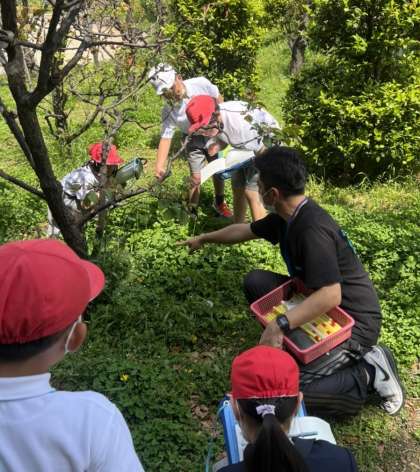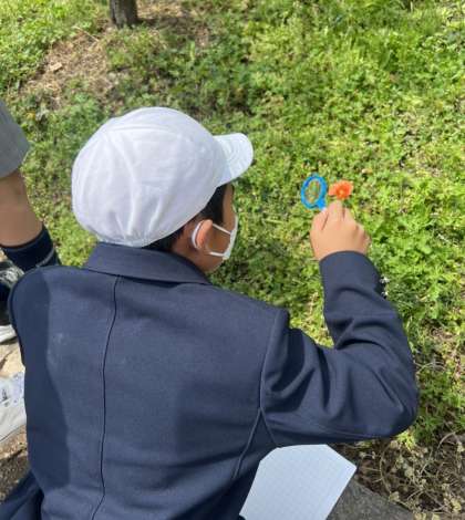 4年生の理科の時間です。4月下旬、高津公園に出かけて、自然観察をしているところです。