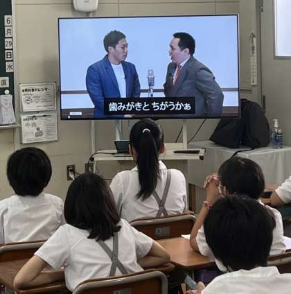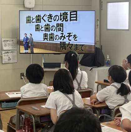 ミルクボーイが歯みがきの大切さを伝える動画「食べたらみがこう」を見ながら、子どもたちも楽しく学習していました。