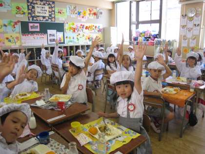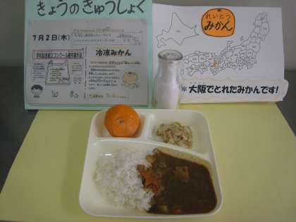 今日のメニューは「牛挽肉と夏野菜のカレーライス(年1回)、ツナとキャベツのマヨネーズいため(マヨネーズ除去食)、冷凍みかん(年2回)、牛乳」でした。カレーライスには、夏野菜であるなすとピーマンや☆型のラッキーにんじんも入っているお楽しみなものでした。冷凍みかんは今の季節ならではのもので、今年は今日と9月27日の年2回出てきます。みかんをそのまま凍らせると乾燥してパサパサになるので、急冷と水つけを繰り返して皮の外に氷の膜を作り、乾燥を防ぐ工夫がなされています。また低温で食べるので甘みが感じられないことから、甘みの強いみかんが使われているそうです。子どもたちは給食を取りに来た時から、『カレーとラッキーにんじんと冷凍みかんやぁ〜』と盛り上がっていました。ちなみに、初めて冷凍みかん食べた1年生は90人(62%)でした。笑顔あふれる給食タイムとなりました。