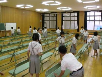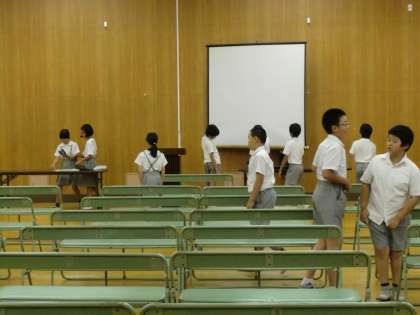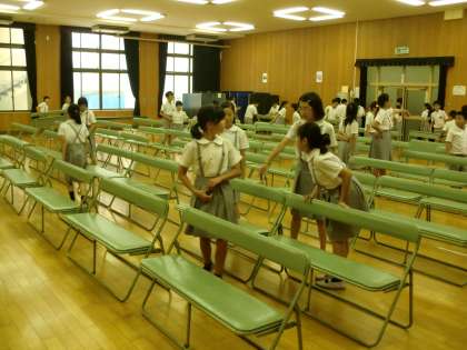 説明会のために、5年生ががんばって椅子を並べています。
