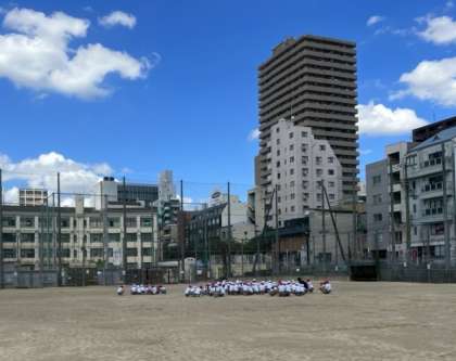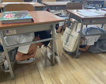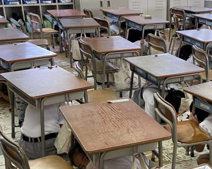 今日9月2日は、大阪880万人訓練の日。中央小学校でも、13:30の防災無線の訓練放送に合わせて訓練をおこないました。ちょうど昼休み時間中だったので、教室にいる子は机の下に入り、グラウンドで遊んでいる子は真ん中辺りに集まっていました。
