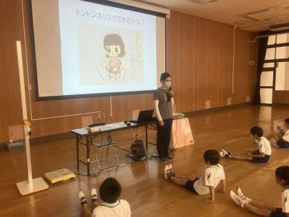 スライドを見ながら、けがに気をつけることや熱中症になりにくい方法など、クイズ形式で考えました。