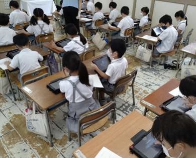 1年生では、来週13日のオンライン学習テストに向けて、タブレットで「Teams」を使う練習をしました。
