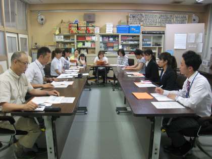 学校給食調理業務民間委託校における学校給食の円滑な実施のために、給食関係者で意見交換を行う委員会を、学期に1回開催しています。教頭、保健主事、給食主任、養護教諭、指導栄養教諭、学校薬剤師、PTA給食委員3名、現場業務責任者、受託会社の担当者2名の計12名が出席しました。7月3日(金)には早くも『食中毒注意報第1号』が発令され、衛生管理の徹底をより図る時期を迎えています。安全・安心・衛生的でおいしい中央小学校の学校給食運営について、各々の立場から意見を出し合い、子どもたちの笑顔あふれる学校給食の創造を確認し、終えました。