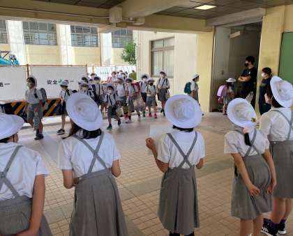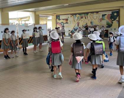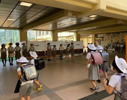 2学期最初のあいさつ週間が始まりました。工事の影響でせまくなったピロティですが、児童会の子どもたちがうまく並んで、元気に取り組んでいます。