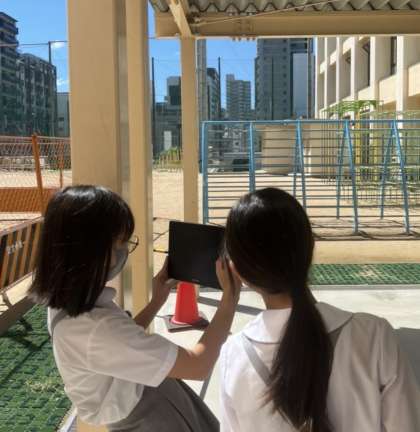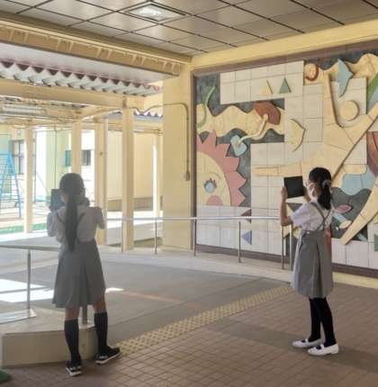6年生の図画工作の時間です。思い出の校舎の絵を描くために、タブレットの写真機能を使って校内を撮影しています。