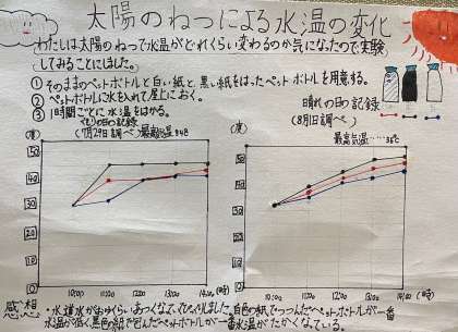 次に、4年生の作品です。太陽の熱によって水の温度がどれぐらい変化するのかを実験しました。条件を変えた3種類のペットボトルを使って調べることで、違いがよくわかりましたね。