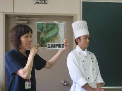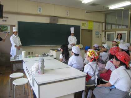1学期最後のクラブには、ヴィアーレ大阪から総料理長とシェフに来ていただきました。なにわの伝統野菜「玉造黒門越瓜(たまつくりくろもんしろうり)」を使った料理講習会で、サンドイッチとスープを作っていただきました。ミニシェフたちは、プロの料理の技に目を輝かせて見ていました。出来上がるとおいしそうに食べ、スープのおかわりには、行列ができていました。「ベイリーフは日本でも手に入るのですか?」など、専門的な質問にも、総料理長から答えていただくことができました。貴重な体験ができ、充実した1学期のクラブの締めくくりとなりました。さらに、2学期も料理の腕を磨いていきます!