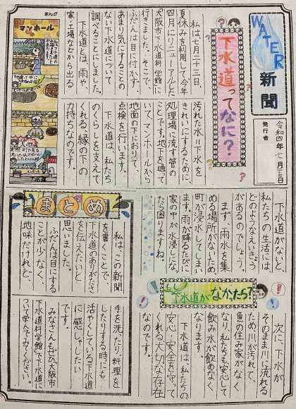 最後は、5年生の作品です。この4月にリニューアルオープンした「大阪市下水道科学館」に行って調べたことを「WATER新聞」にまとめました。色づかいがとても素敵な作品です。私たちの生活にとって欠かせない下水道の大切さがよくわかりますね。