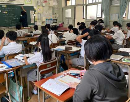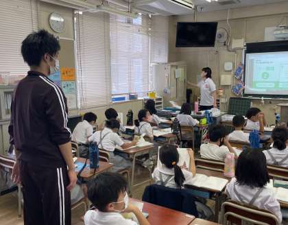 3名の大学生が、今日から4週間、中央小学校で教育実習をおこないます。放送朝会で自己紹介をしたあと、さっそく担当のクラスに入って、子どもたちの学習の様子を見学しました。