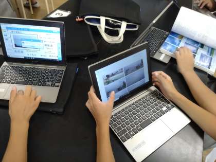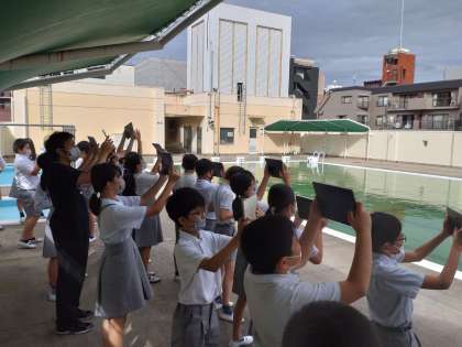 「雲を観察しよう」という学習で、学校の屋上から見える雲をタブレットで撮影して、デジタル観察シートにまとめました。