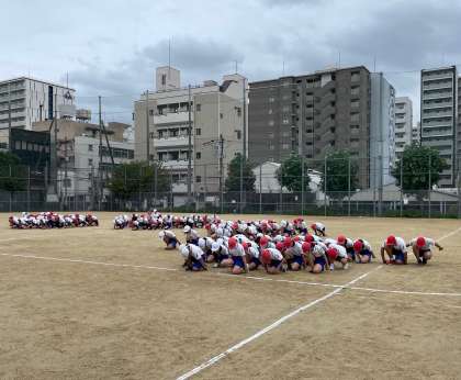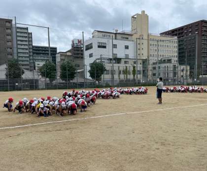 6年生の練習の様子です。まず、運動委員会の子どもたちが前に出て、準備運動をおこないます。その後、団体演技の隊形変化を確認しました。