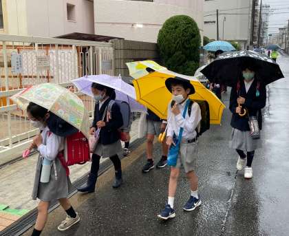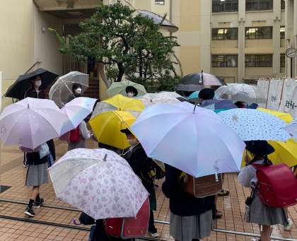久しぶりに雨の中の登校となりましたが、子どもたちはとても元気にあいさつができています。教育実習生も正門を入ったところで子どもたちを出迎えています。