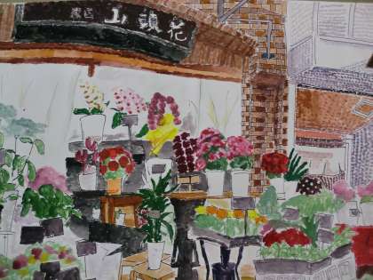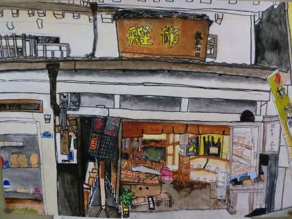 空堀商店街の様子を描いています。