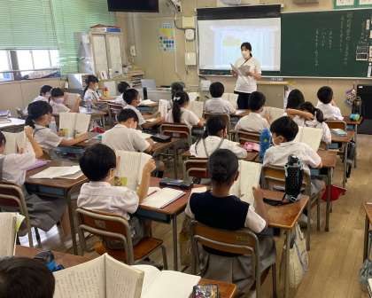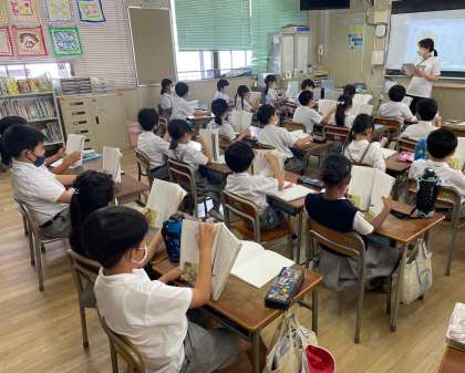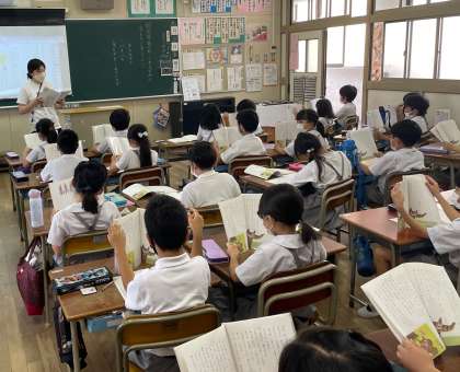 2年生の国語の時間です。物語文「ニャーゴ」の読み取りを通して、登場人物の気持ちを想像しながら音読の仕方を工夫する学習をおこなっています。
