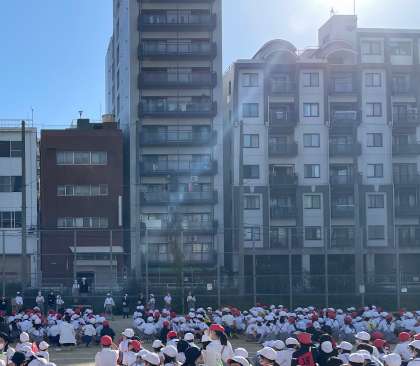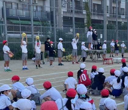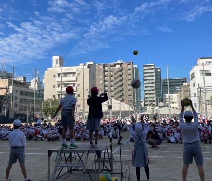 集会委員の子どもたちが投げ上げるボールの個数の合計を当てるゲームです。見落とさないように、みんなとても集中して見ていました。