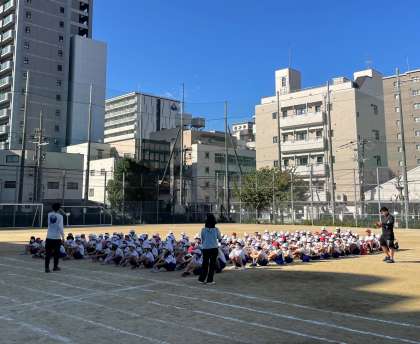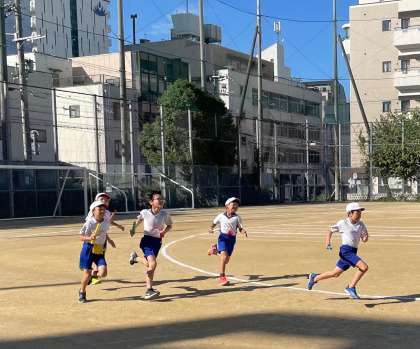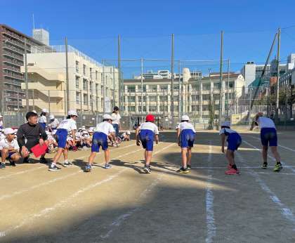 4年生の練習の様子です。まずは、リレーです。トラックのカーブをうまくまわる感覚をつかんでいきます。