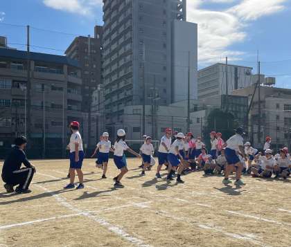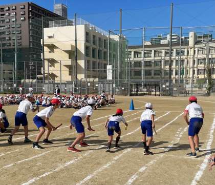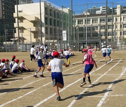 5年生の練習の様子です。まずは、リレーからおこないます。バトンパスのタイミングをはかりながら、スムーズに受け継いでいけるよう練習しています。