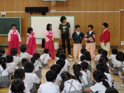 まず、「アンニョンハセヨ」というあいさつを教えてもらい、みんなで元気にあいさつをしました。そして、きれいな民族衣装を着させてもらい、どのようなときにどのように着るのか、詳しく説明してくださりました。その後、韓国・朝鮮の遊びを4つ教えていただきました。「おもしろい!」「むずかしいけど楽しい!」などと言って、夢中で遊んでいました。