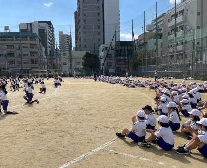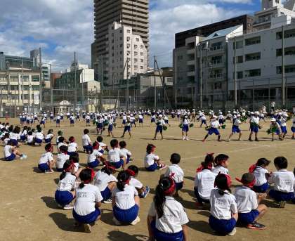 その後、団体演技の練習をお互いに見せ合いました。見ている子どもたちは、それぞれの演技に引き込まれていました。