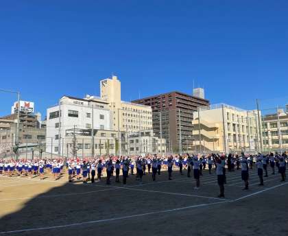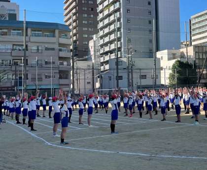 5・6年生の合同練習の様子です。まずは、運動委員会の子どもたちが前に出て、準備運動をします。