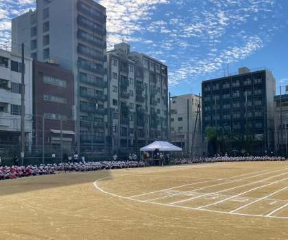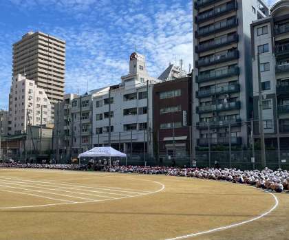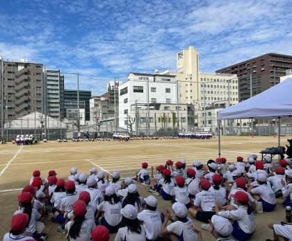 明日の体育学習発表会本番に先立って、今日は、全学年の子どもたちが集まり、相互に団体演技を鑑賞する機会を設けました。