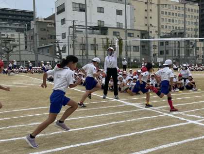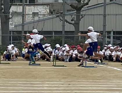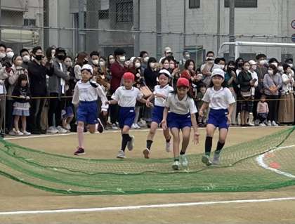 最初の競技は、3年生の個人走です。ハードルを越えたり、ネットをくぐり抜けたりしながら、ゴールテープをめざします。
