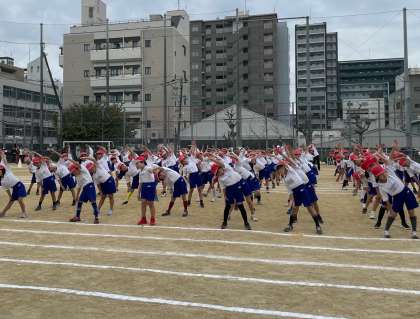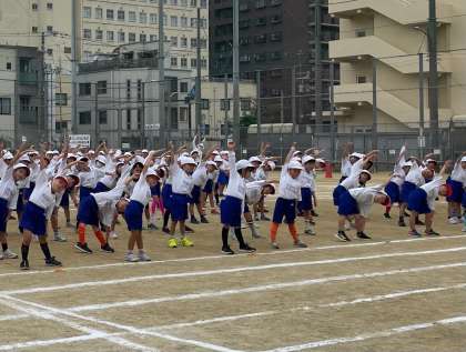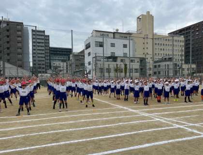 続いて、1・2年生の部です。みんなきれいに整列して、準備運動をおこないます。一生懸命に身体を動かす姿が微笑ましいです。