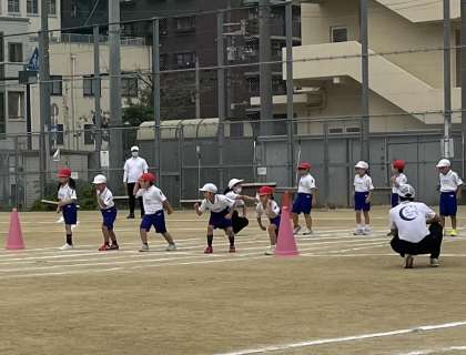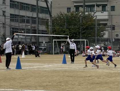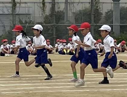 まずは、1年生のかけっこです。広いグラウンドで、ゴールテープをめざして、力いっぱい走ります。