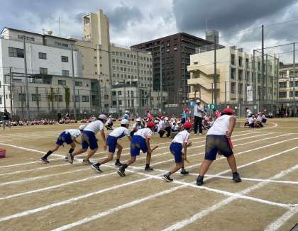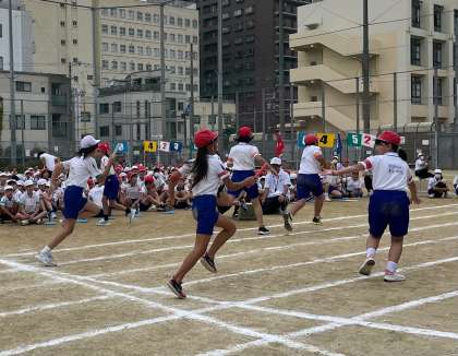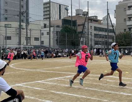 次に、5年生のリレーです。うまくタイミングを合わせながら、チームのみんなの思いが託されたバトンをつないでいきます。