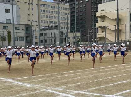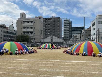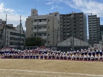 体育学習発表会のフィナーレを飾るのは、6年生の団体演技です。パラバルーンや布などを使ったパートと身体だけで表現するパートの対比が見事です。緩と急、静けさと華やかさが巧みに組み合わされ、フィールドに不思議の国「ワンダーランド」が創りあげられました。